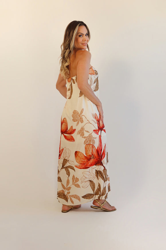 Este vestido longo sem alças é leve e versátil, possui uma estampa floral sofisticada perfeita para o dia a dia. Seu tecido garante conforto e movimento, enquanto seu estilo permite combinações criativas com diferentes calçados e acessórios.