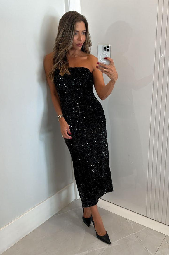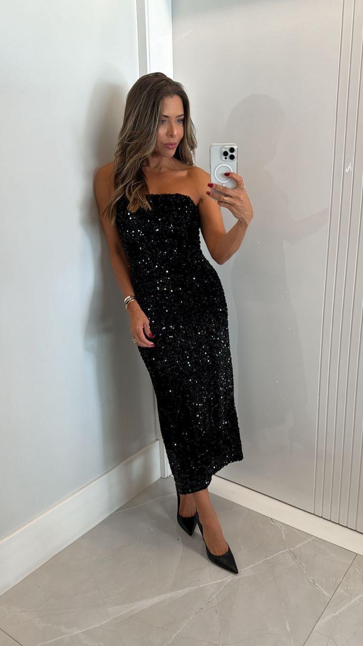 VESTIDO MIDI SEM ALÇAS VELUDO PAETÊ ITAIM PRETO